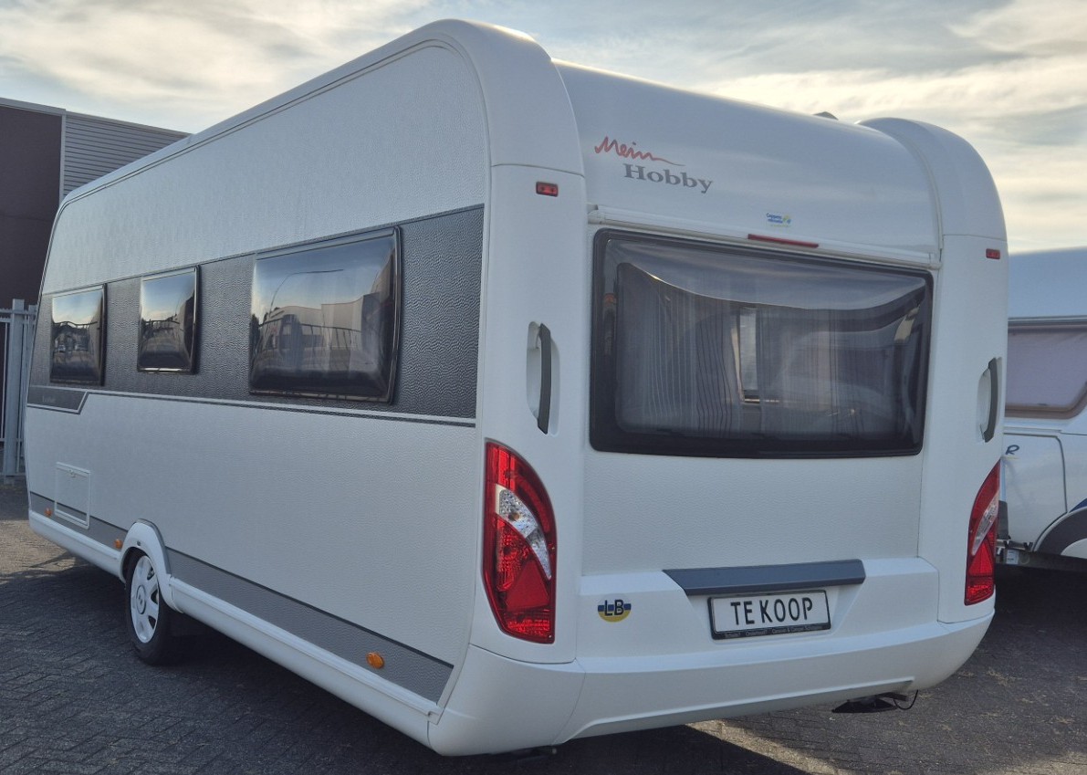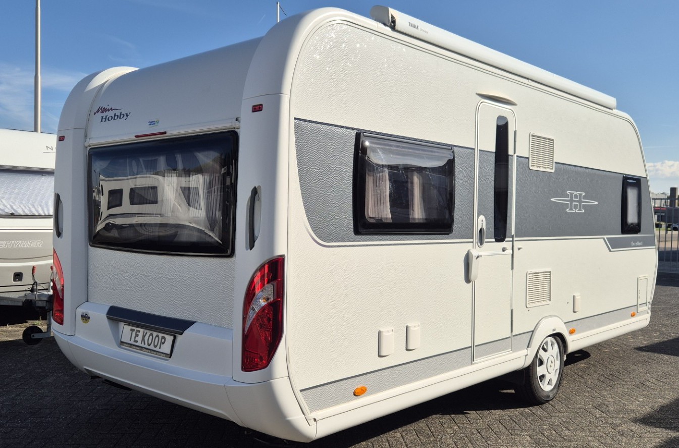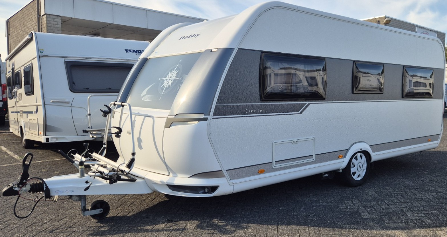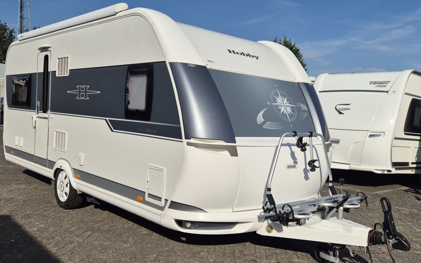 Hobby Caravan met o.a. voortent (kleine en grote), vaste Thule cassetteluifel, Thule fietsdrager geschikt voor Ebikes en Enduro mover